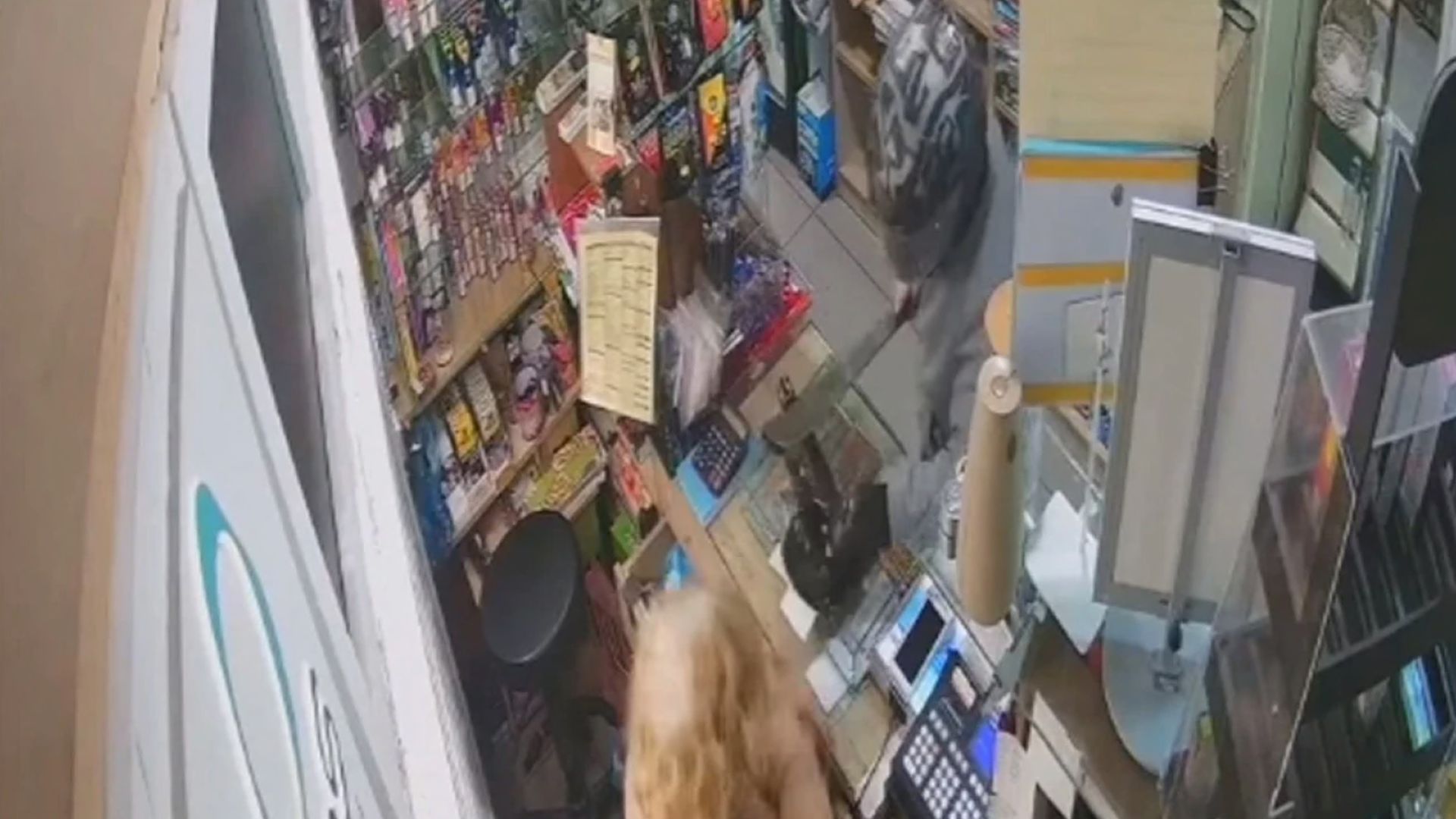 Security camera footage shows the woman swiftly grabbing the rolling pin, which was conveniently located next to the register, and striking the assailant’s hand before chasing him out of the store.
