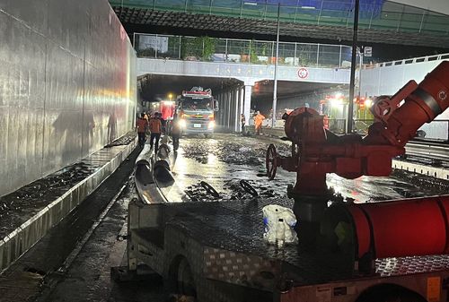 Photos and video from the scene showed rescue workers establishing a perimeter and pumping brown water out of the tunnel as divers used rubber boats to move in and out of the area.