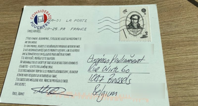 “I used to smoke, and today I use nicotine pouches and feel better. They are clean, discreet and don’t bother anyone around me. I’m grateful these products exist. Don’t overload pouches with taxes or restrictions like cigarettes. If prices rise too much or if the products disappear, many of us risk going back to tobacco,” reads the postcard sent to a Socialist MEP.