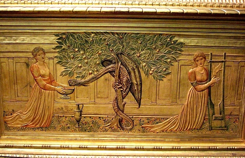 Not trusting them, Hera also put a serpent named Ladon among the branches of the tree or grove. This guarded the golden apples of the Garden, preventing the Hesperides from taking any more.